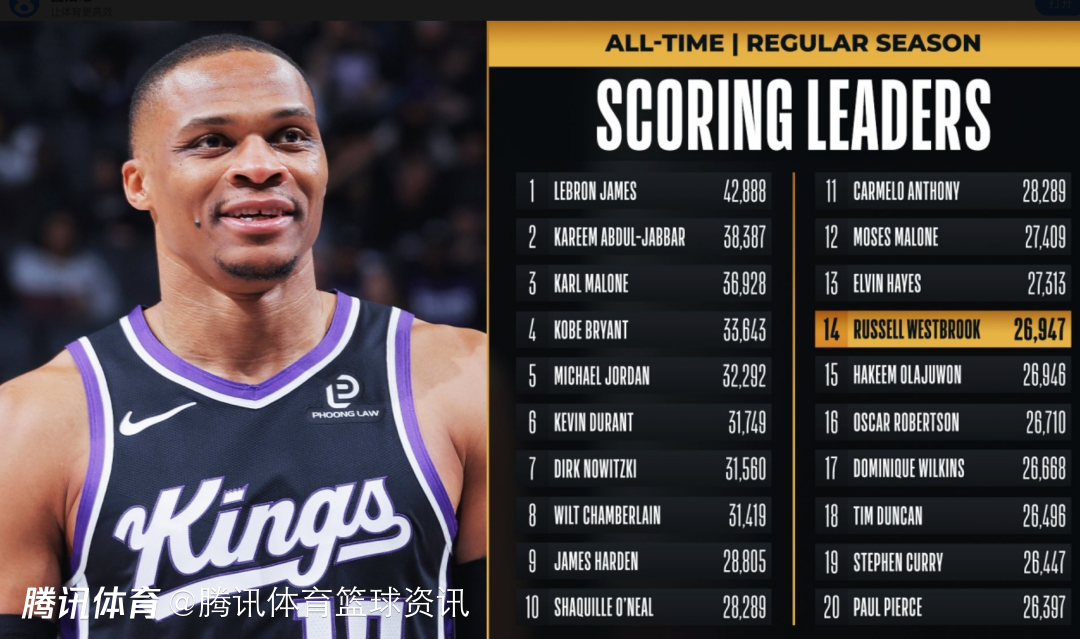 2026-02-05 11:40北京时间2月5日,NBA常规赛,国王主场对阵灰熊,威少在首节命中三分球,这样一来,他的生涯总得分超越奥拉朱旺(26946分),生涯总得分上升至历史第14位。