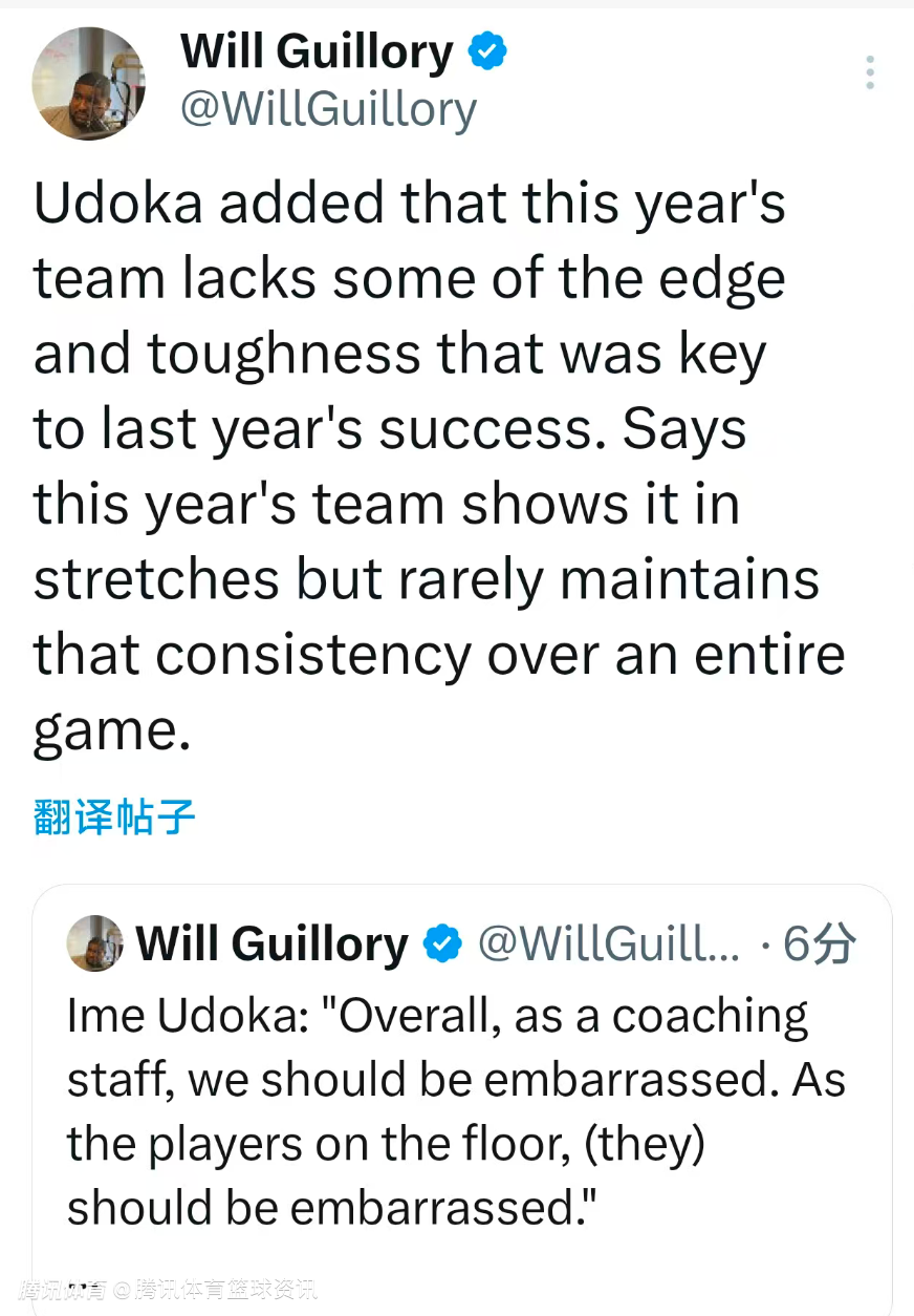 关于本场失利,乌度卡说道:“总而言之,作为教练组,我们理应感到羞愧;场上的球员们,也应该感到羞愧。”乌度卡表示,火箭从比赛一开始就缺乏强硬度与细节专注度。他补充道,这支球队缺少上赛季成功所依赖的那种锐气与硬度。
