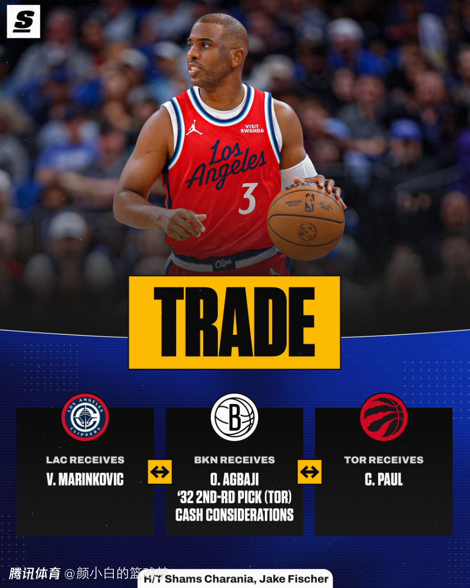 2026-02-05 12:00北京时间2月5日,洛杉矶快船终于送走了40岁的克里斯-保罗,猛龙、篮网、快船三方交易中CP3被送往寒冷的多伦多,这笔交易中猛龙将阿巴基、2032年次轮签送到篮网,快船送给篮网350万现金腾出一个空间,篮网帮快船吃掉保罗的薪金空间。