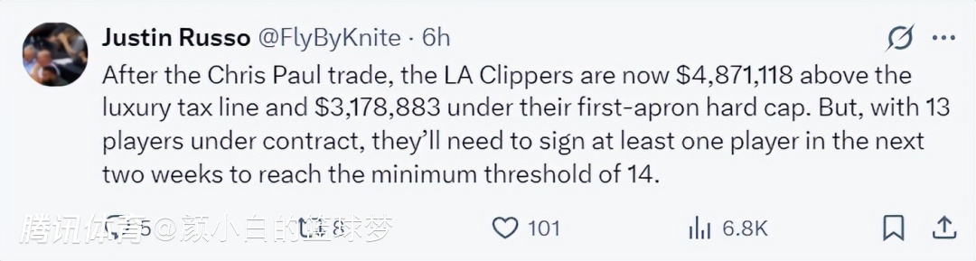 跟对于快船来说送走保罗利好太多了,保罗的交易完成后,快船的总薪资超出奢侈税线4871118美元低于硬帽3178883美元,快船目前保障名单只有13份,球队需要在两周内签下一人满足联盟最低14份保障名单的最低门槛。