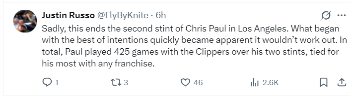 这笔交易发生后,快船记者Justin Russo写道:保罗在快船的生涯就此终结,令人遗憾。起初双方都希望朝着理想的方向发展,但很快彰显出矛盾无法延续下去。保罗职业生涯为快船出战425场比赛,这一数字是他效力过的任何球队中最高纪录。