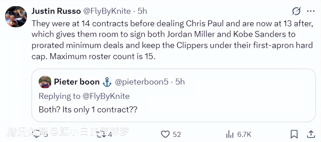 快船队一直有意将桑德斯、乔丹米勒两位双向合同球员的合同转为正式合同,送走保罗后大名单只剩下13人正好可以转正这两位出色的年轻小将。而且乔丹-米勒、科比-桑德斯两人的合同会转为最低的新秀合同,这样快船可以保持在第一奢侈税征点之内。