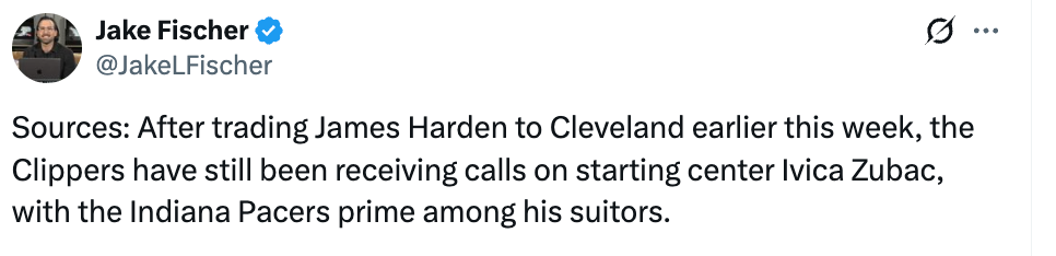2026-02-05 13:50北京时间2月5日,据美记Jake Fischer报道,在本周早些时候将哈登交易至骑士之后,快船队仍然收到了多支球队关于首发中锋祖巴茨的询价电话,其中印第安纳步行者队是最主要的追求者。