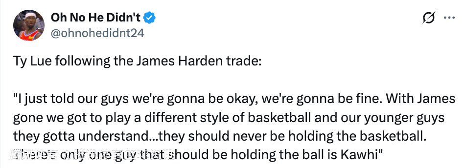 另外谈及哈登的离开,卢表示:“我告诉队员们,我们会没事的,一切都会好起来的。哈登走了,我们必须打出不同的风格,我们的年轻球员必须明白,他们永远不应该持球。只有一个人应该掌控球权,那就是小卡。”