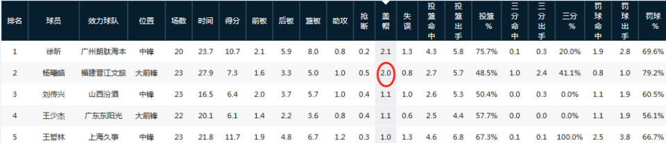 杨曦皓代表福建出战23场比赛,首发19场,场均得到27.9分钟的出场时间,交出7.3分5.0篮板1.0助攻2.0封盖,其中,2.0次封盖位居所有新秀球员最高,仅次于徐昕的2.1次,毫无疑问是一个非常出众的护框手。