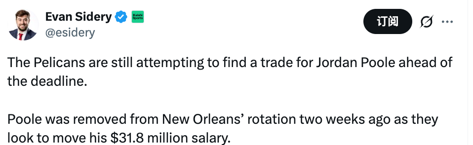 2026-02-05 22:30北京时间2月5日,据美记Evan Sidery报道,鹈鹕队仍在尝试交易截止日前送走乔丹-普尔。