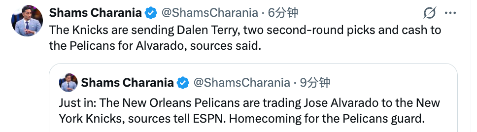 2026-02-06 01:50北京时间2月6日,据名记Shams报道,鹈鹕将阿尔瓦拉多交易至尼克斯,换回达伦-特里和2个次轮签、若干现金。此前尼克斯曾和公牛达成交易,尼克斯从公牛那里得到了特里。