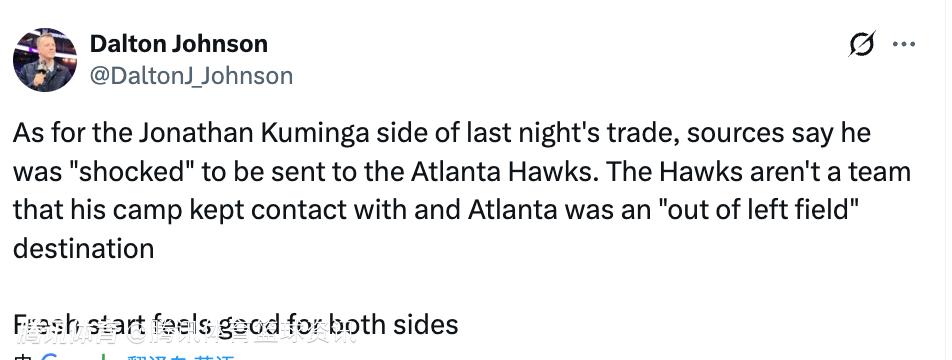 Johnson表示,关于库明加,据消息源透露,对于被交易至亚特兰大老鹰队,他本人感到 “十分震惊”。老鹰队并非其团队此前保持联系的球队,亚特兰大对他来说是一个完全出乎意料的下家。不过对双方而言,全新的开始都不失为一件好事。