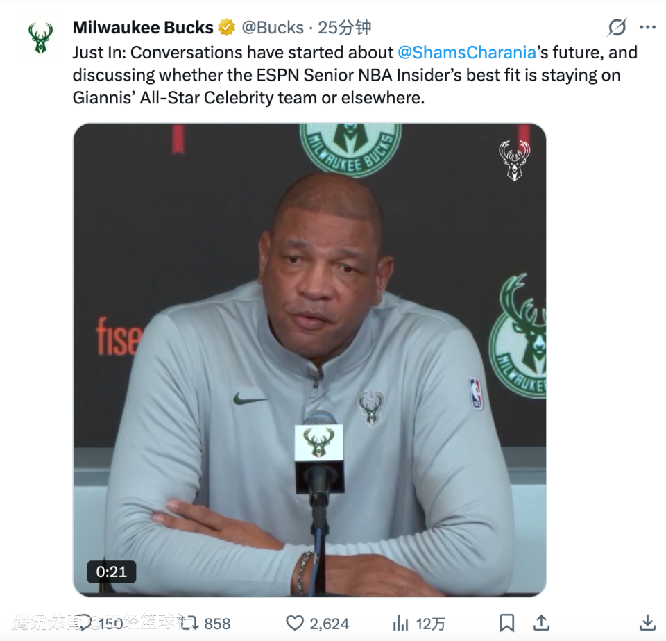 在Shams爆出字母哥确定留队之后,雄鹿官方社媒分享动态,发出一个打哈欠的表情。随后雄鹿官推再次发文:“最新消息,关于Shams Charania的未来已经开始讨论,ESPN高级NBA内幕专家的最佳选择是留在字母哥的明星全明星队还是去其他地方。”