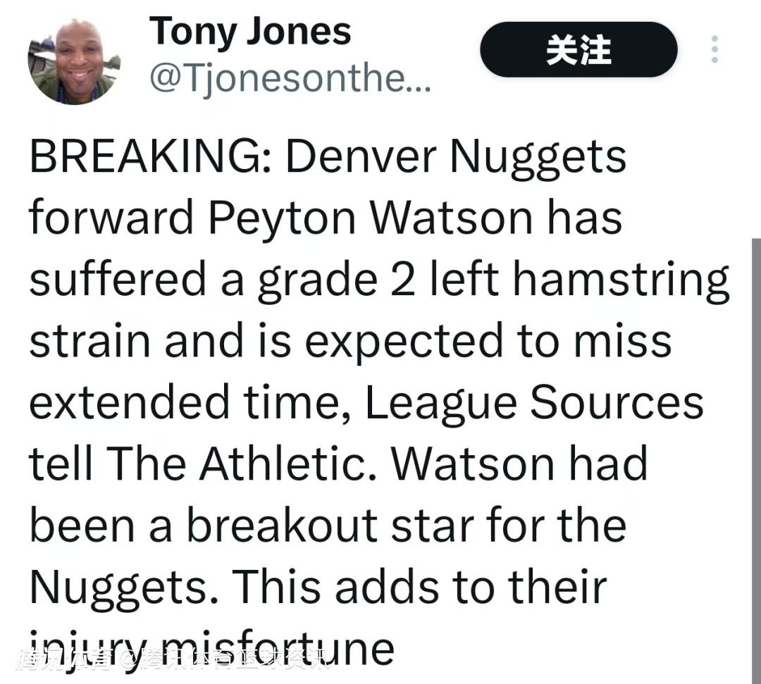 2026-02-06 09:20北京时间2月6日,据The Athletic援引联盟消息源透露,掘金前锋佩顿-沃特森遭遇左腿腘绳肌二级拉伤,预计将长期缺阵。沃特森本赛季已是掘金队内一大惊喜爆发球员,此次伤病进一步加剧了球队的伤病困境。