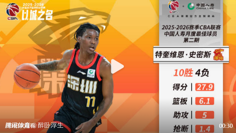 赢麻!CBA官宣:深圳核心贺希宁+史密斯 包揽月最佳球员+外援
