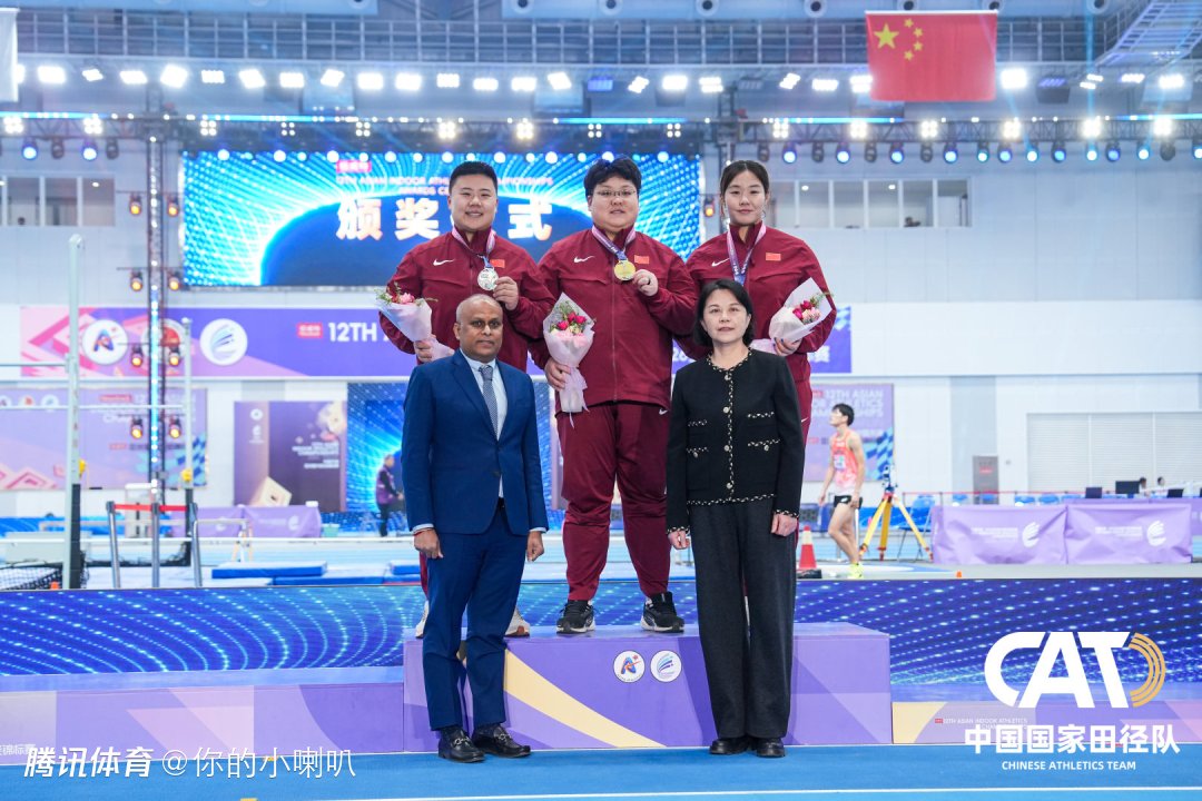 三级跳远是本届比赛首金项目,中国队选手粟文、焦新评、马英龙成功包揽前三名。其中,粟文以第五跳16米55的成绩实现卫冕,收获个人第二枚室内亚锦赛金牌,焦新评(16米47)与马英龙(16米45)分别收获银、铜牌。