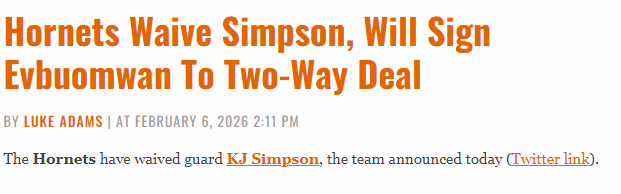 2026-02-07 05:30北京时间2月7日,黄蜂队官方宣布,球队已裁掉后卫KJ-辛普森。