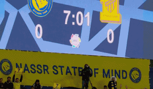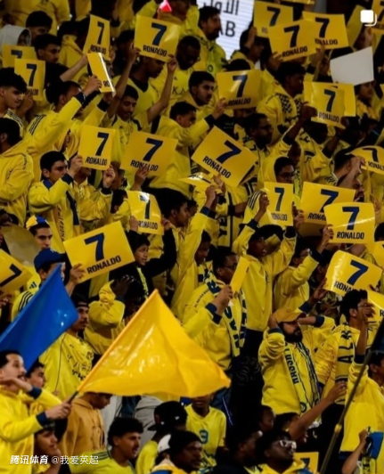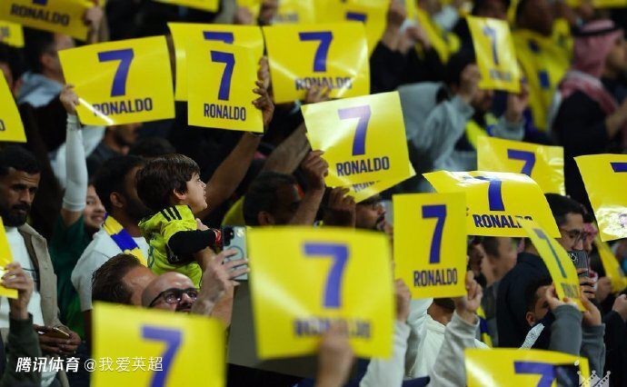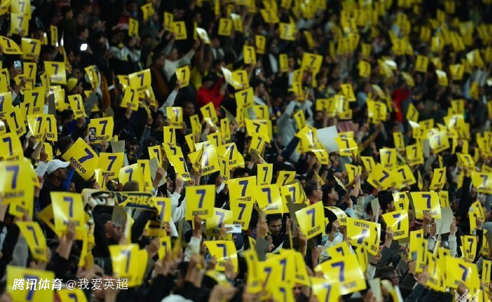 比赛第7分钟,主场的利雅得胜利球迷一起拿着写有C罗名字和7号的黄色纸板,并且随着鼓声的节奏一起喊“Siuu”,同时将牌子举起高唱。
