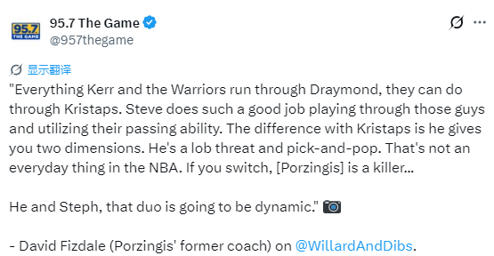 菲兹戴尔说道:“科尔和勇士围绕追梦打造的所有战术,都能移植到波尔津吉斯身上。科尔太擅长围绕这类球员设计战术、发挥他们的传球能力了。而波尔津吉斯的不同之处,在于他能为球队带来双重进攻维度,他既是空接终结的威胁点,也能完成挡拆外弹投篮,这在NBA里可不是随便哪个球员都能做到的。一旦对手选择换防,波尔津吉斯就会成为无解的杀器。他和库里的组合,一定会打出极具冲击力的比赛。”