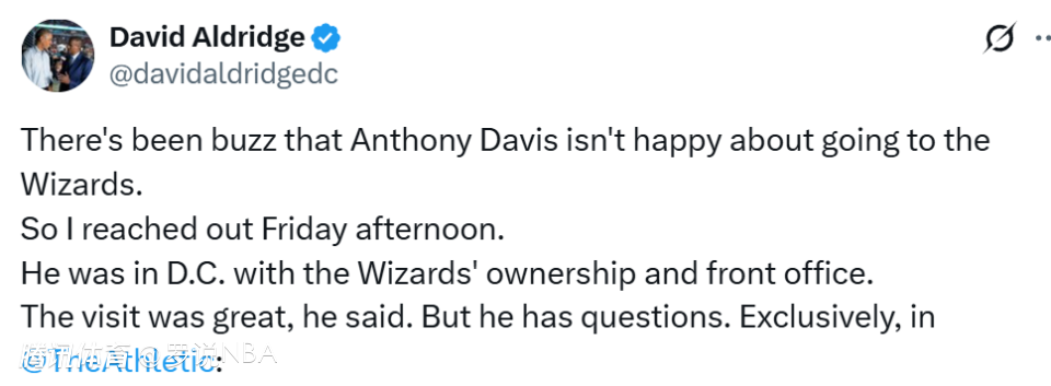 体育画报资深NBA记者曼尼克斯曾在报道中称,戴维斯“似乎对加盟奇才兴致不高”,并在播客节目中再次强调这一观点。但