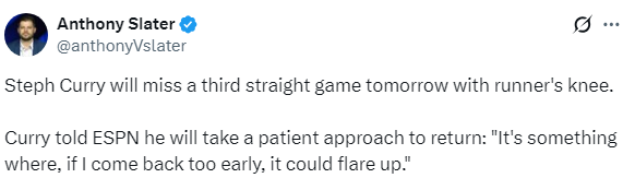 库里因跑步膝(髌股关节疼痛综合征)缺战湖人,连续休战三场,对于库里的伤情,勇士随队记者Anthony Slater报道,库里在比赛中基本就像跑马拉松一样,据我了解,‘跑步膝’就是膝盖有一些隐痛、肿胀,几周前他在明尼苏达时伤情突然加重,他和队医正在努力控制,预计他会很谨慎。