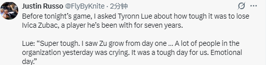 泰伦-卢说道:“太难受了。祖巴茨的成长,我从头看到尾,失去他之后,球队里好多人都哭了,对我们而言这是难熬的一天,一整天心里都五味杂陈。”