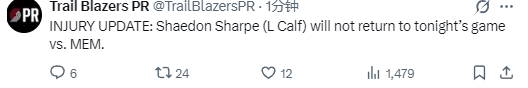 2026-02-07 12:50北京时间2月7日,NBA常规赛继续进行,开拓者队对阵灰熊队。本场比赛进行到第三节,开拓者队官方宣布,夏普因左小腿受伤,本场比赛将不会回归。
