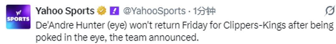 2026-02-07 13:30北京时间2月7日,NBA常规赛继续进行,国王队对阵快船队。本场比赛进行到第三节,国王队球员亨特在防守时左眼睛被对手打中流血,随后国王队官方宣布,亨特将退出本场比赛的剩余比赛。