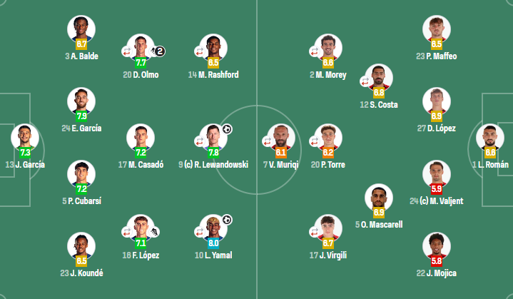 巴塞罗那(4-3-3):霍安-加西亚;孔德,库巴西,埃里克-加西亚,巴尔德;费尔明(84'托马斯-马科斯),卡萨多,奥尔莫(67'贝尔纳尔);亚马尔(78'巴德吉),莱万多夫斯基(78'坎塞洛),拉什福德(67'费兰-托雷斯)