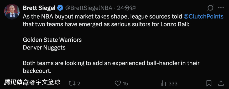 2026-02-08 04:00北京时间2月8日,据记者Jack Fischer报道,勇士在交易截止日过后,即将把目光放在买断市场,他们有意签下后卫朗佐-鲍尔。
