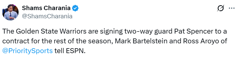 2026-02-08 04:30北京时间2月8日,据名记Shams报道,勇士已经正式将帕特-斯宾塞的双向合同转为正式NBA合同,合同期持续到赛季结束。这位身高1米88的控球后卫,现在有资格出战本赛季剩余常规赛,同时也具备季后赛参赛资格——这是他此前双向合同所不具备的。另外,勇士有兴趣签下此前被爵士裁掉的朗佐-鲍尔(球哥)。