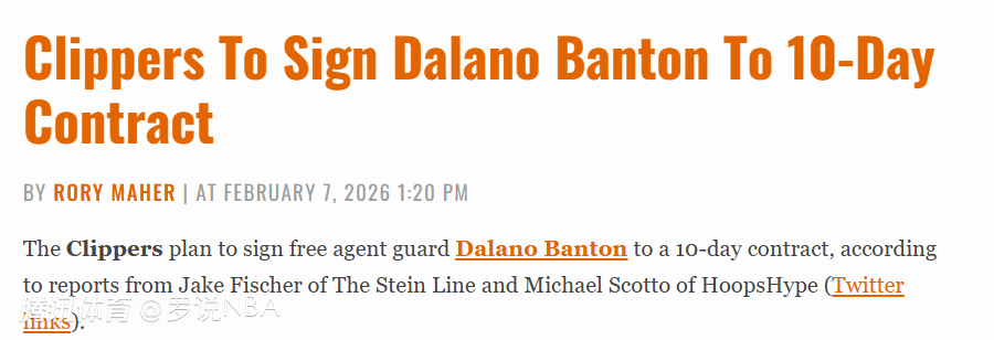 2026-02-08 04:30北京时间2月8日,据名记Fischer和Scotto报道,此前连续送走哈登和祖巴茨的快船又有新运作,他们用一份10天短合同签下自由球员达拉诺-班顿。