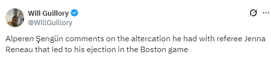 申京谈及自己在对阵凯尔特人的比赛中与裁判珍娜-里诺发生冲突并被驱逐出场一事,他说道:“说实话,是我太不成熟了。当时场面太激烈,情绪上来了,说了一些不该说的话。我对此很后悔,比赛一结束我就去了更衣室,和那位女裁判握手并向她道歉。”
