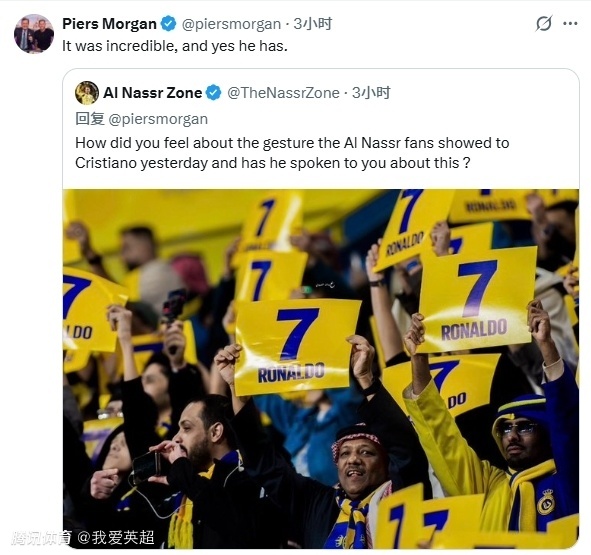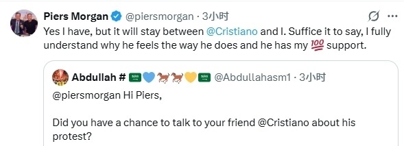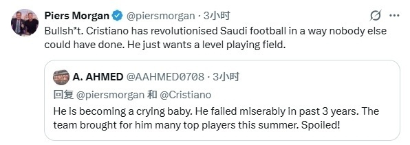 此前,因为不满沙特联的转会运作方式,已经连续两轮未参加利雅得胜利比赛。而摩根自然不会放过这一热点事件,他在回复网友的留言时,毫无意外地表达了对C罗的支持。摩根直言:“我完全理解他的感受,并且我百分之百支持他。”