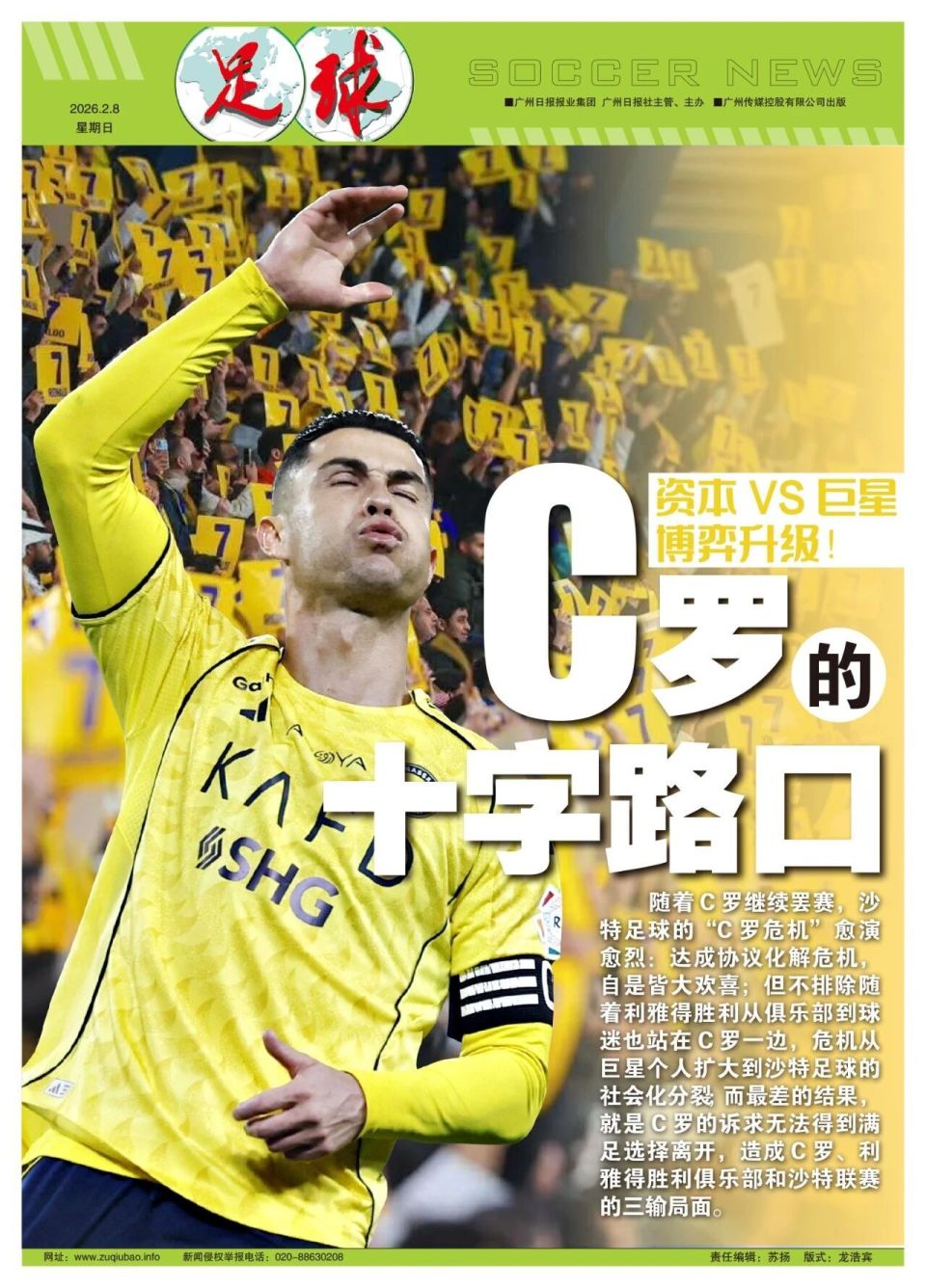 2026-02-08 12:10撰稿/寒冰随着葡萄牙巨星的持续罢赛,沙特足球的“C罗危机”愈演愈烈,而且未来走向愈发不确定。英国媒体认为,事态的进一步恶化意味着任何结局都有可能性:沙特公共投资基金和沙特联赛,与C罗达成协议化解危机是皆大欢喜;但不排除随着利雅得胜利教练、球员、球迷,甚至俱乐部也站在C罗一边,危机从巨星个人扩大到沙特足球的社会化分裂;而最差的结果,就是C罗的诉求无法得到满足选择离开,造成C罗、利雅得胜利俱乐部和沙特联赛的三输局面。