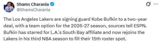 2026-02-08 13:40北京时间2月8日,根据NBA名记Shams报道,湖人队与科比-巴夫金签下一份为期两年的合同,其中包含2026-27赛季的球队选项。
