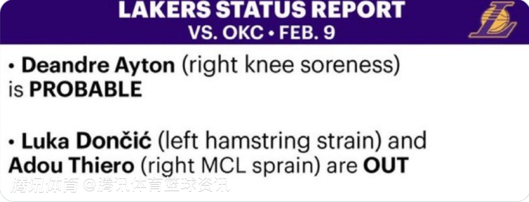 湖人vs雷霆伤病报告:东契奇因腿筋伤势继续缺席 艾顿大概率出战