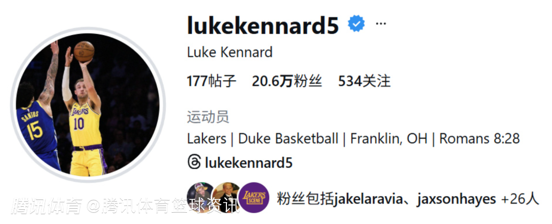 湖人新援肯纳德更新INS头像 选用紫金生涯首粒三分瞬间