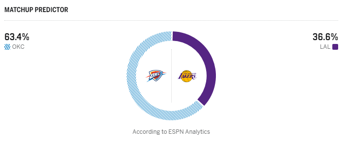 对于本场比赛,ESPN预测湖人赢球概率为36.6%,雷霆赢球概率为63.4%;此前两队已经交手过一次,当时湖人92-121惨败雷霆29分。