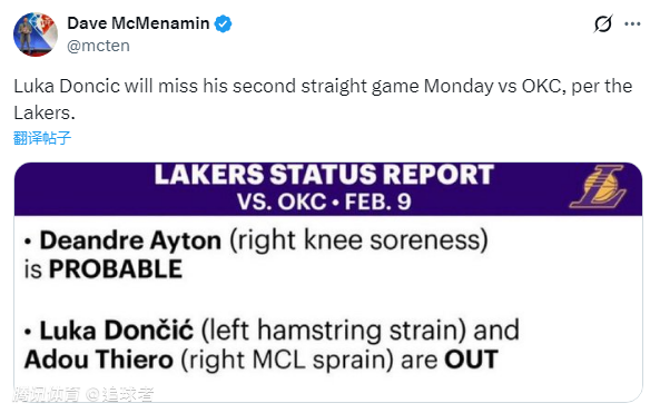 湖人对阵雷霆的伤情——东契奇(左腿筋拉伤)和阿杜-蒂耶罗(右膝内侧副韧带扭伤)因伤继续休战,艾顿(右膝酸痛)大概率出战,75%可能性复出。