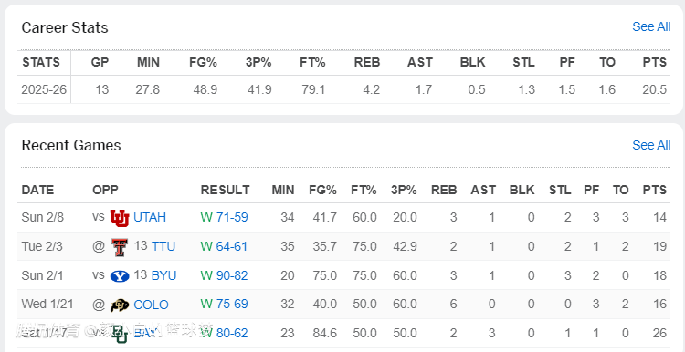 2026-02-09 18:30在达林-彼得森的带领下堪萨斯大学已经豪取六连胜。这位身高6尺6寸,体重96公斤的彼得森是一位重型后卫,6尺6寸也就是1.98米,而1.98米的后卫大家都会联想到迈克尔-乔丹、科比-布莱恩特、德文-布克、亚历山大等人。