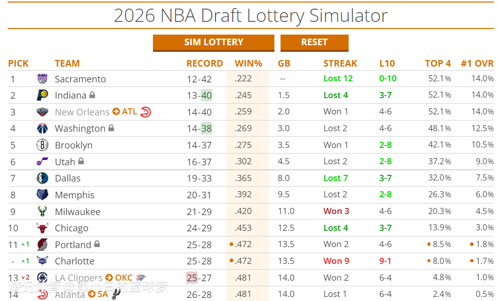 目前国王、步行者、鹈鹕(老鹰)三支球队的状元签概率都是14%,奇才的状元签概率12.5%,篮网状元签概率10.5%,这五支球队是最可能选中彼得森的球队,彼得森这样炸裂的球员也能在每支球队都能立足。