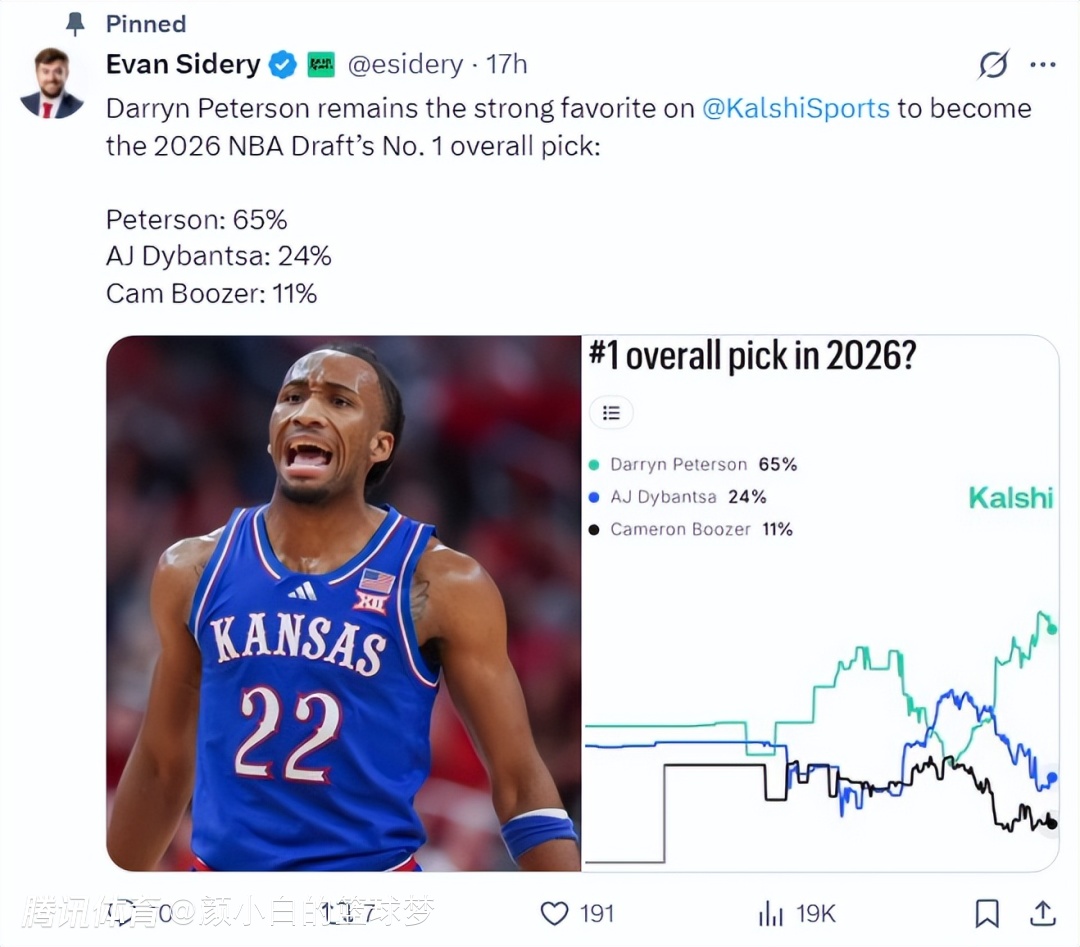 根据美国数据媒体的预测,彼得森在2026年的状元概率已经高达65%,而AJ-迪班萨只有24%,NBA名宿布泽尔之子卡梅隆-布泽尔仅仅只有11%。