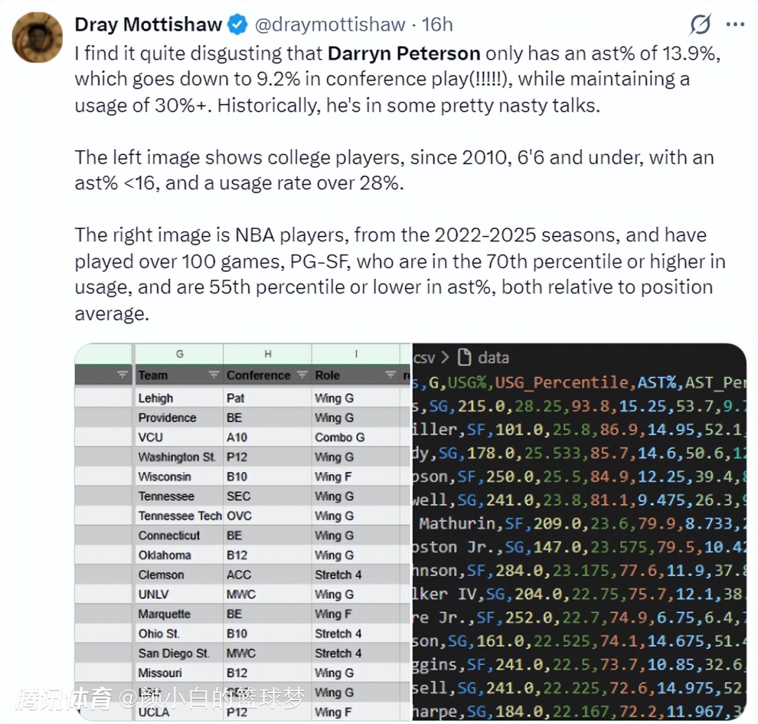 根据NCAA记者Dray Mottishaw的数据,彼得森的助攻率只有13.9%,自2010年以来的NCAA身高6尺6寸的球员平均的助攻率高达28%,自2022年-2025年这种身高6尺6的球员,使用率超过30%的球员平均助攻率也在联盟55位之前,彼得森助攻率远低于平均水准。
