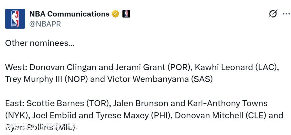 NBA官宣周最佳:卡斯尔约翰逊分别当选 小卡克林根文班等人获提名