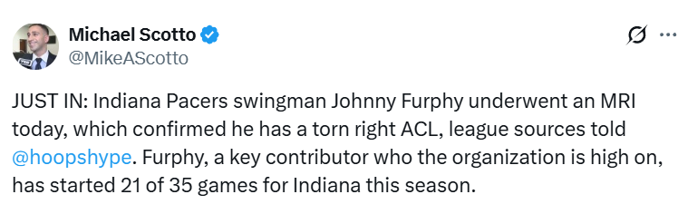 2026-02-10 06:10北京时间2月10日,据HoopsHype记者Michael Scotto援引联盟消息人士透露,步行者侧翼球员约翰尼-弗菲在周一接受了核磁共振检查,结果显示其右膝前十字韧带撕裂。