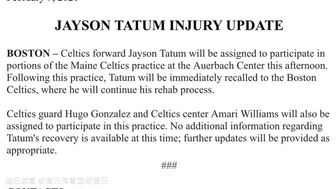 凯尔特人前锋塔图姆将于今日下午被安排前往奥尔巴赫中心,参加缅因凯尔特人队的部分训练。训练结束后,塔图姆将立即被凯尔特人召回,继续进行康复训练。