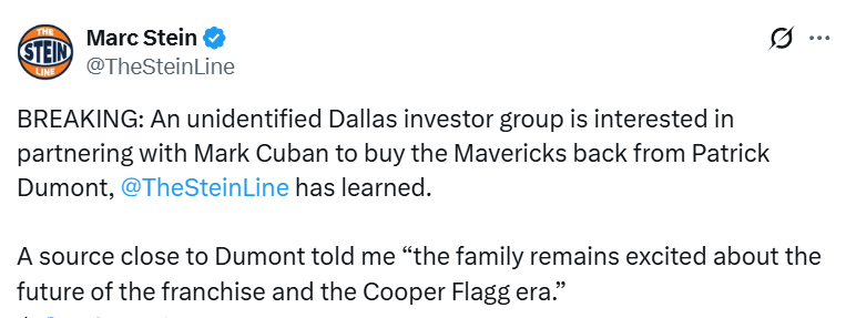 2026-02-10 06:30北京时间2月10日,据名记Marc Stein报道,达拉斯一个未具名投资集团有意与独行侠前老板马克-库班合作,从帕特里克-杜蒙特手中回购独行侠队。