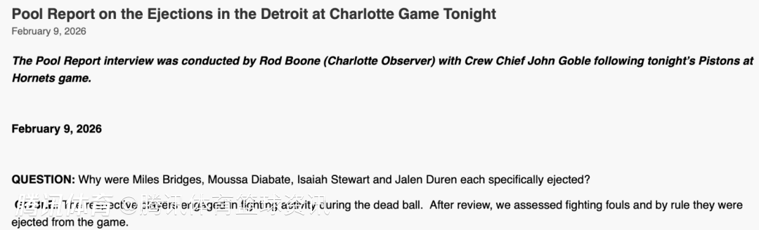2026-02-10 12:00北京时间2月10日,NBA常规赛继续进行,黄蜂队104-110不敌活塞队。本场比赛,双方爆发大规模冲突,迪亚巴特、杜伦、布里奇斯和斯图尔特均被驱逐。赛后,当值主裁判约翰-戈布尔接受采访。