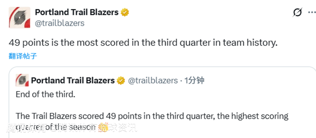 上半场战罢,开拓者以64-65暂时落后,而在第三节,卡马拉、阿夫迪亚迎来爆发,帮助开拓者在本节单节轰出49-22,让球队就此奠定了巨大的领先优势。这49分是开拓者本赛季单节最高得分,同时也是球队历史上第三节单节最高得分。