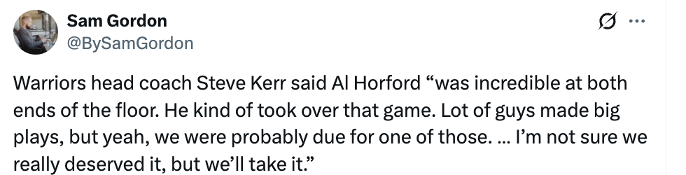 谈到此役拿到16分9篮板6助攻的霍福德,科尔表示:“他是一位名人堂级别的球员。尽管已经39岁,他依然保持着极佳的身体状态。他的基本功无可挑剔,出色的脚步、扎实的手活,以及可以助队摆脱困境的篮球智商,他是一名非常非常优秀的球员,我们很幸运能拥有他。他在攻防两端的表现都堪称现象级。他几乎接管了这场比赛。”