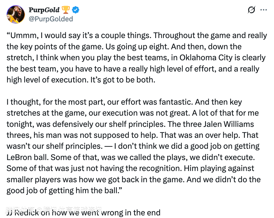 谈及这场失利,雷迪克表示:“我认为问题出在几个方面。贯穿整场比赛,尤其是在关键时刻——当我们领先8分时,以及最后收官阶段。面对联盟顶级球队,雷霆显然是这样的球队,你必须同时保持极高的努力程度和战术执行水平。”