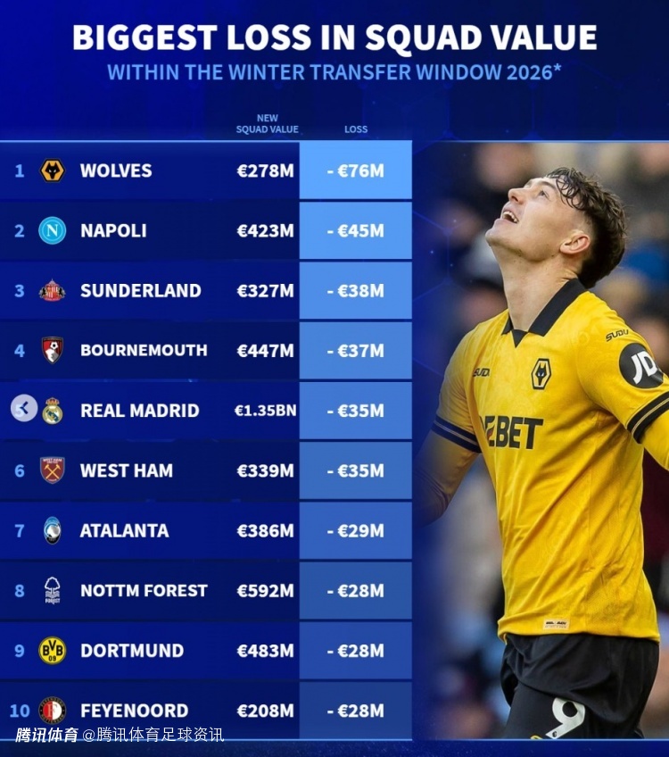 德转球队冬窗身价跌幅榜:狼队跌7600万欧居首 皇马跌3500万列第五