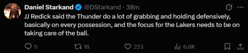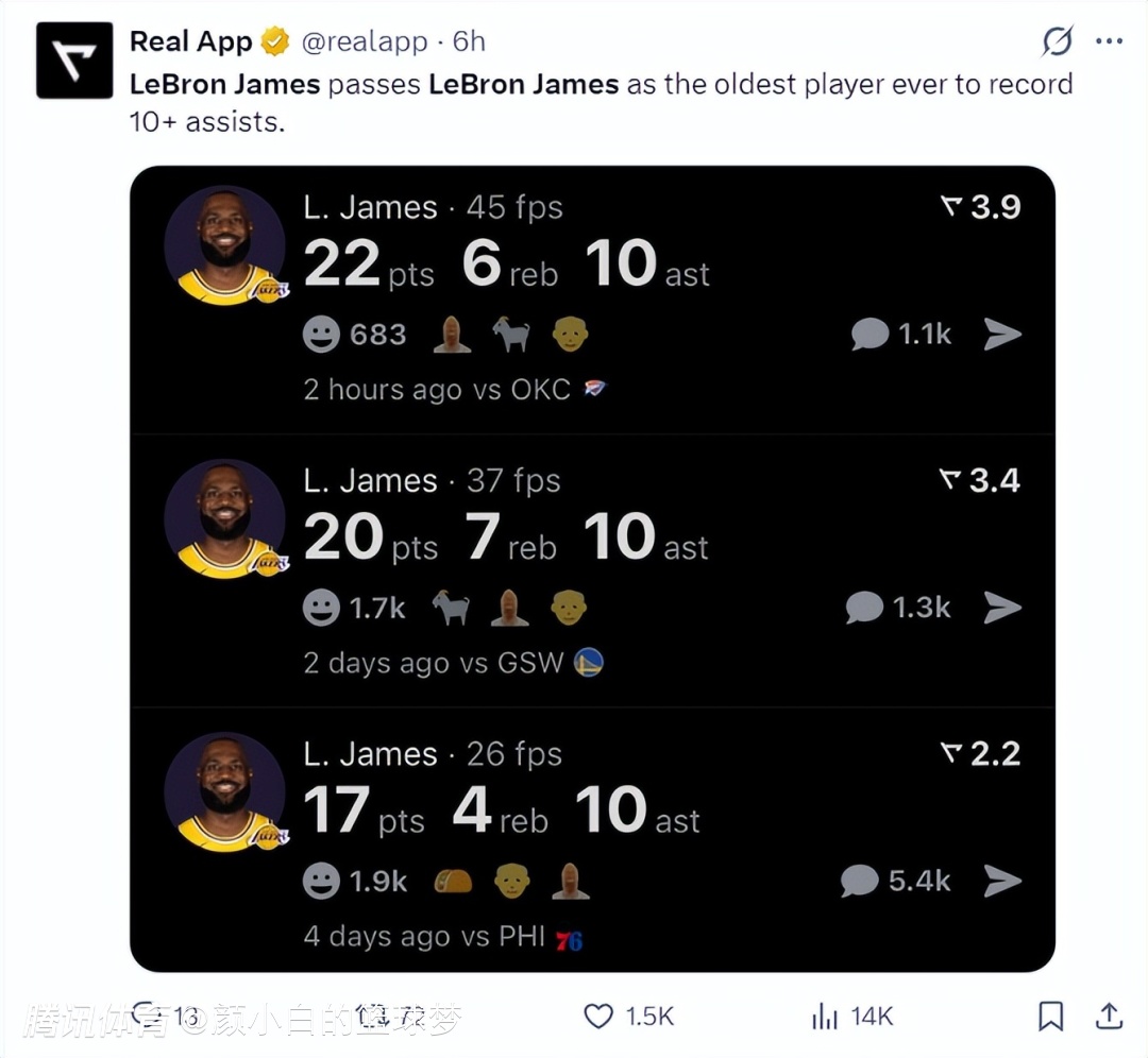 詹姆斯这场比赛拿到22+10+6,连续三场比赛拿到10+助攻是历史最年长的球员,而詹姆斯的言论就是侧面说明湖人阵容孱弱,而且湖人根本没有雷霆那样的防守资源。